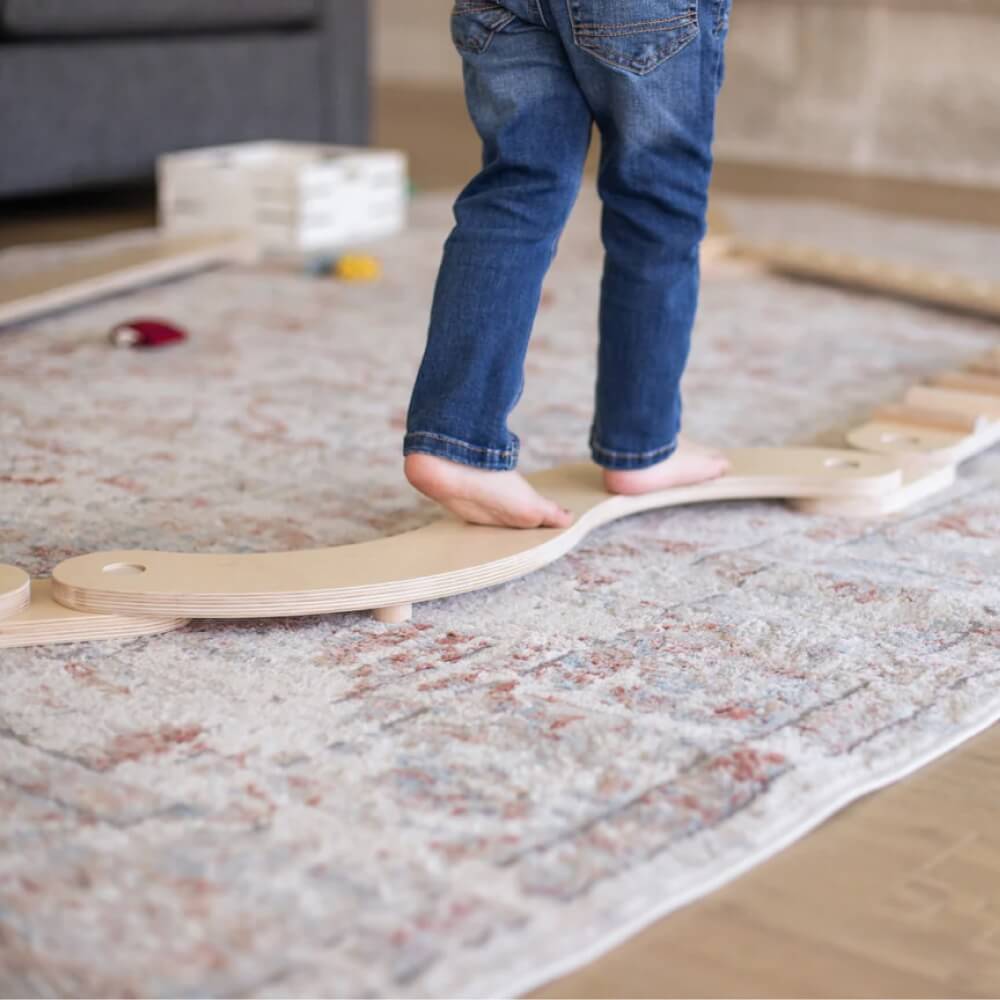 The modular wooden balance beam offers a flexible, open-ended play experience, allowing children to configure the beams into various shapes for enhanced creativity and challenge. Its intuitive design encourages independence as children rearrange beams and bases to create their unique obstacle courses.