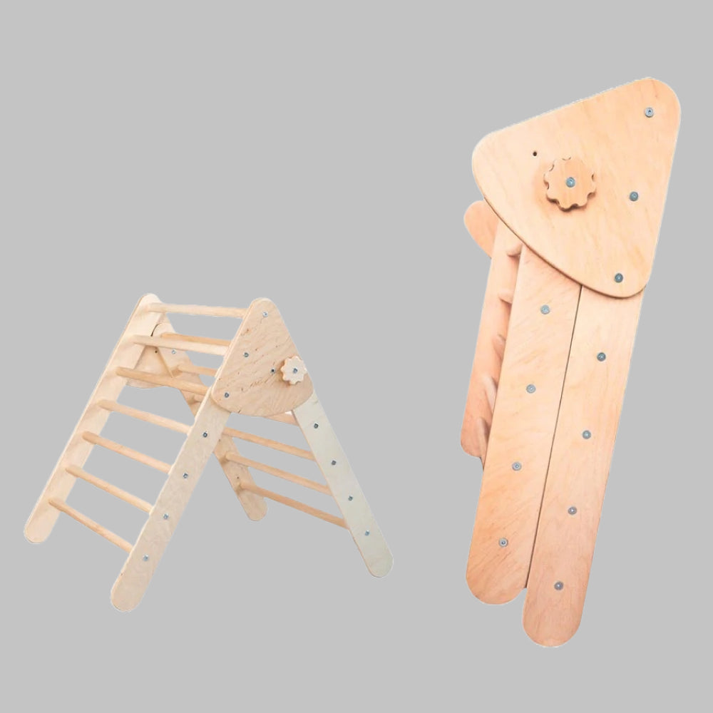 Montessori Climbing Playset: This durable wooden set features a foldable triangle, arch, and ramp, promoting independence, balance, and motor skills. Safe and easy to assemble, it’s ideal for children aged 8 months to 6 years for indoor or outdoor fun.