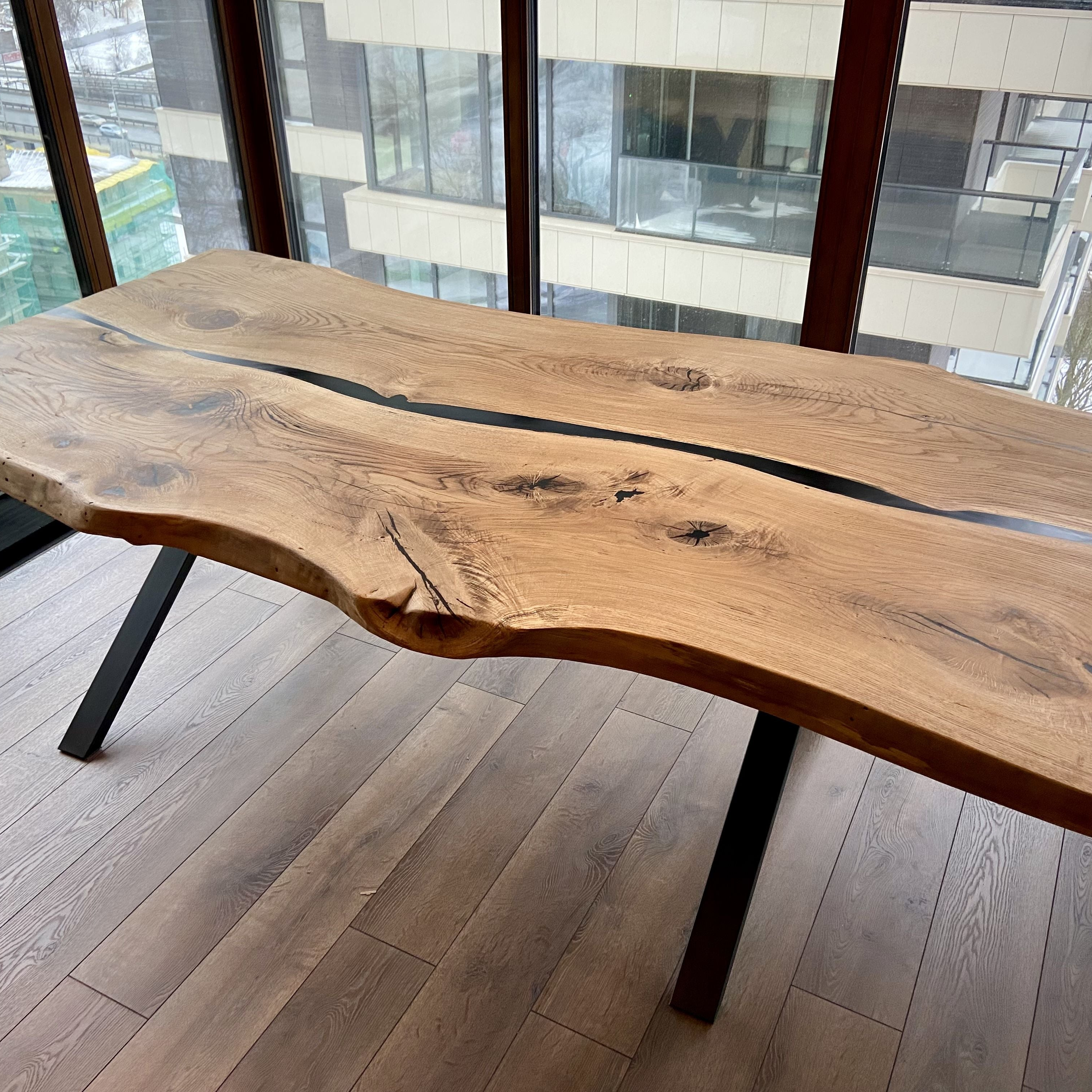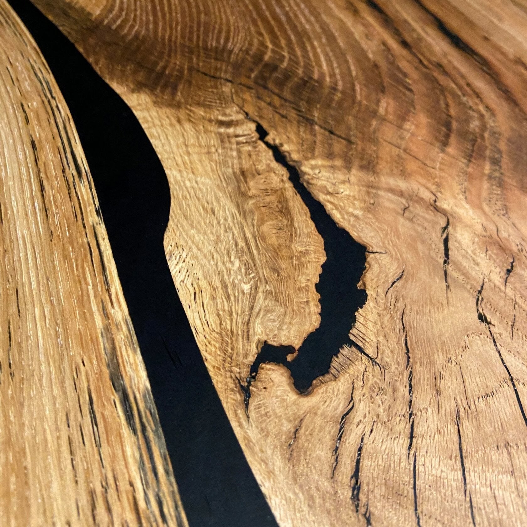 The Nature Flow dining table showcases a harmonious blend of natural beauty and artisan design. Crafted from two full slabs of oak, each table retains its unique live edge, highlighting the wood’s organic shape and intricate grain patterns. The hand-poured epoxy river adds a touch of sophistication, creating a captivating contrast between the smooth, glossy surface and the raw, natural edges. With its generous size and thickness, the Nature Flow table makes a statement in any dining space, serving as both a functional piece and a work of art.